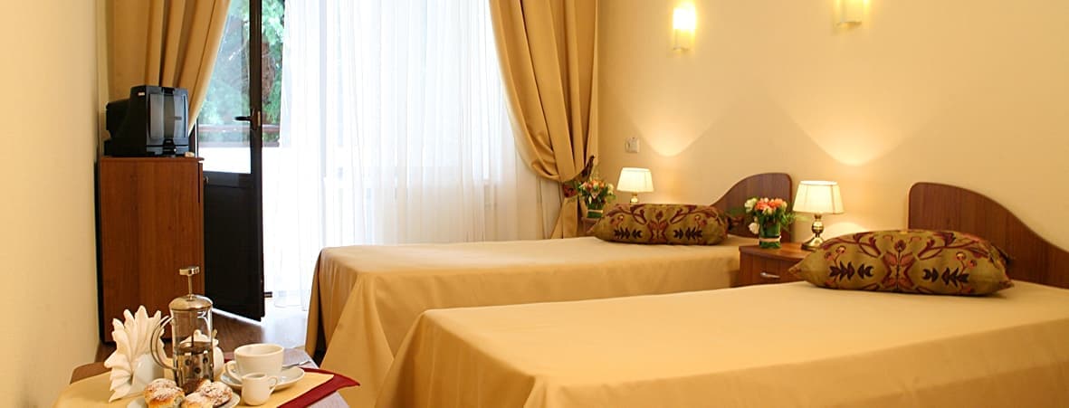 Площадь номера - 12-16 кв.м. 2 осн. места. 1 доп. место. Мебель: зеркало, кровати односпальные, прикроватные тумбочки, столик кофейный, стулья, шкаф. Оборудование: кондиционер, телевизор, холодильник. Санузел: с душем, туалетные принадлежности, фен. Сервис: Wi-Fi бесплатно, смена полотенец (ежедневно), смена постельного белья (1 раз в 3 дня), уборка номера (ежедневно).