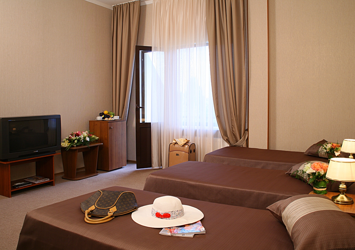 Площадь номера - 16-20 кв.м. 3 осн. места. 1 доп. место. Мебель: вешалка, зеркало, кровати односпальные, обувная полка, прикроватные тумбочки, столик журнальный, стулья, шкаф. Оборудование: кондиционер, телевизор, холодильник. Санузел: с душем, туалетные принадлежности, фен. Сервис: Wi-Fi бесплатно, смена полотенец (ежедневно), смена постельного белья (1 раз в 3 дня), уборка номера (ежедневно).